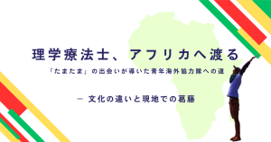 もし理学療法士として海外で働くことに興味を持っている人がいれば、日本理学療法士協会(JPTA)は、医療系専門職団体として初めて独立行政法人国際協力機構(JICA)と覚書を締結しています。これにより、海外協力隊派遣について、JPTAの推薦を受けて海外協力隊に参加することができるようになりました。また、国際的に活躍したい人に向けたその他の情報も積極的に発信しています。